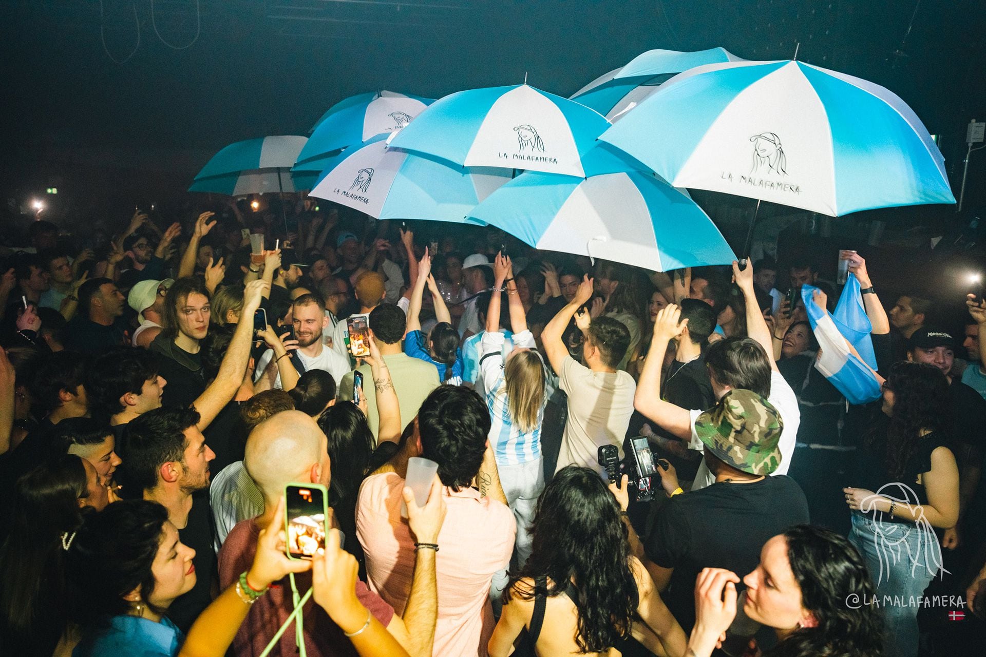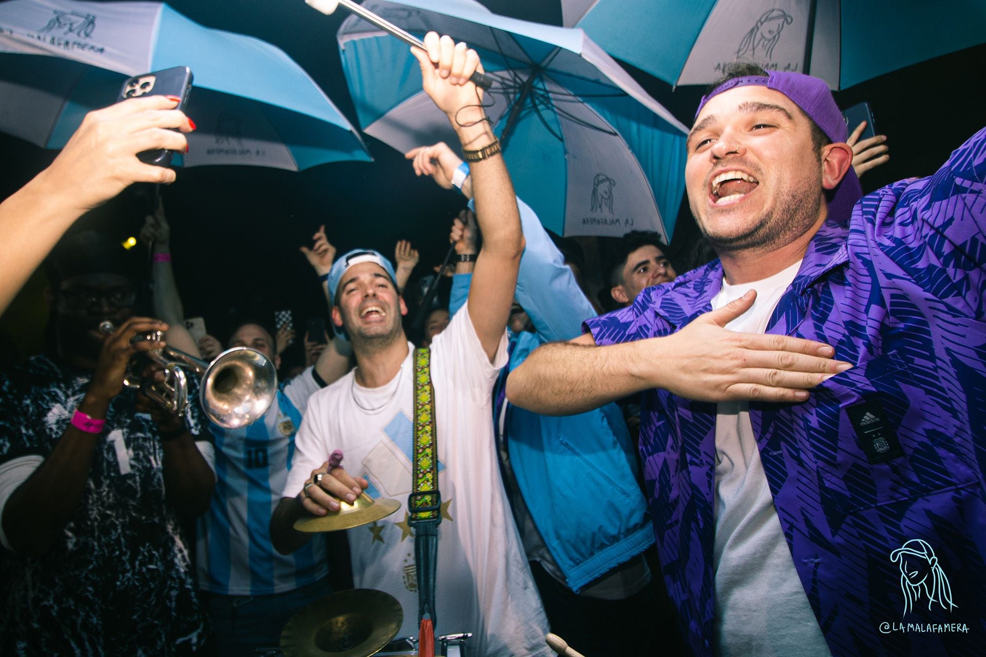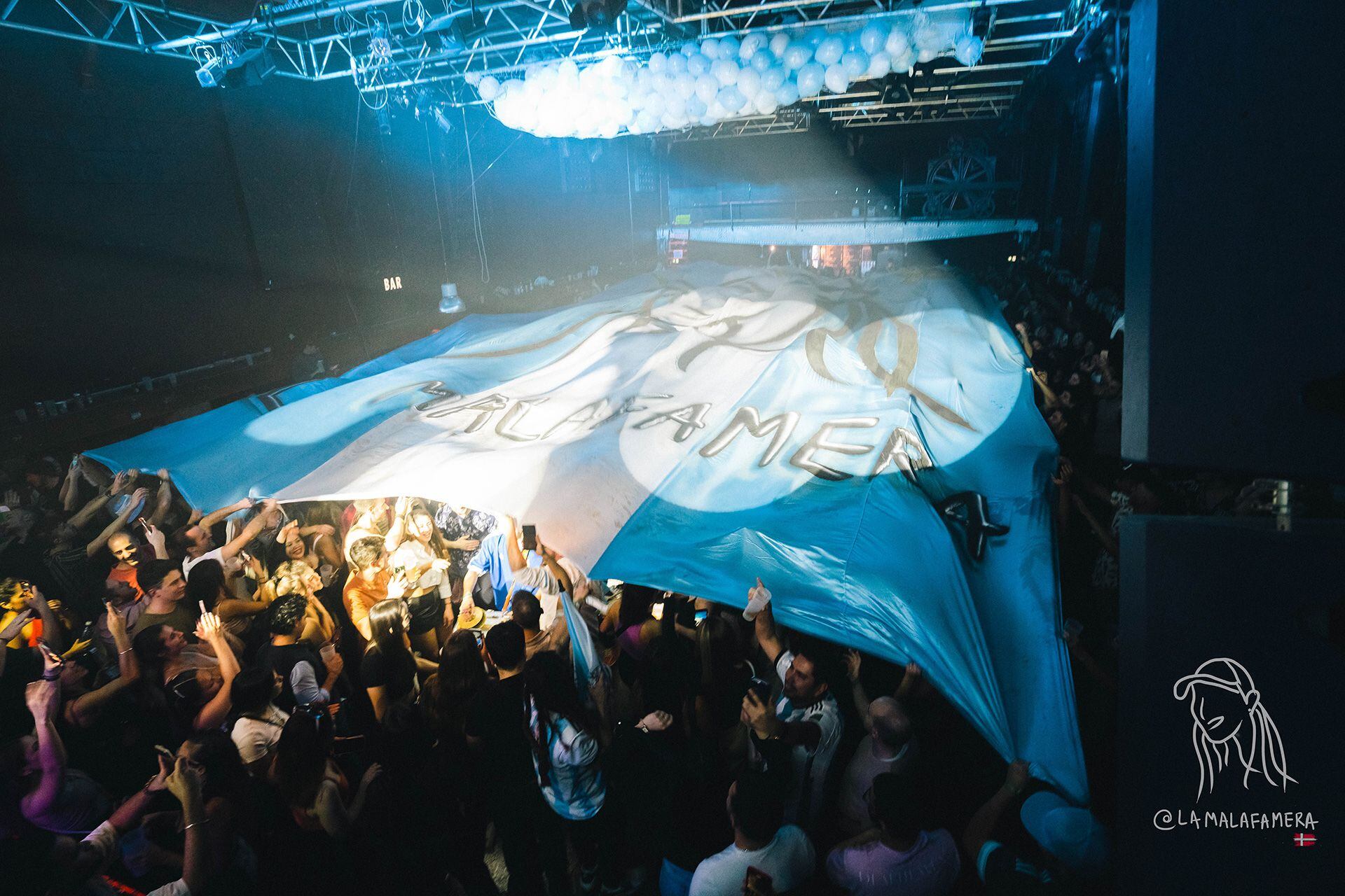 “La Malafamera es una fiesta con una propuesta performática, que tiene como concepto, a través de la experiencia, trasladar mentalmente a la audiencia a la Argentina -dicen a coro-. Partiendo desde la música que suena (cumbia, RKT, reggaeton, cuarteto y guaracha), integramos a lo largo de la noche varios estímulos, muchos relacionados a nuestra cultura”. Los estímulos: desplegar una bandera Argentina gigante sobre el público simulando lo que se vive en una tribuna de cancha cuando baja un telón; suelta de 500 globos desde el techo; efectos sensoriales como los cañones de humo y musicales como el sonido metálico de megáfono del camión chatarrero de mediodía de sábado; confetis; bailarines y bailarinas de cumbia; presentaciones sorpresivas de murga, trompeta, paraguas y el carnaval futbolero; y la pieza de confraternidad indispensable, el fernet. “Muchos de estos estímulos tienen como objetivo integrar a la audiencia como parte de la performance, generando un sentimiento de pertenencia y comunidad, sin importar la nacionalidad”, describen.
